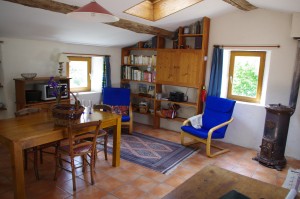 Les murs sont enduits à l’ancienne, les poutres apparentes et le bois largement utilisé dans l’aménagement intérieur. Deux fauteuils appellent à la lecture des très nombreux ouvrages de la bibliothèque. Outre les romans, vous y trouverez de beaux livres sur le Diois et le Vercors, des guides touristiques et naturalistes, des ouvrages de référence sur la vie en montagne, sur le Vercors, l’histoire locale… mais aussi les ouvrages écrits par la propriétaire !